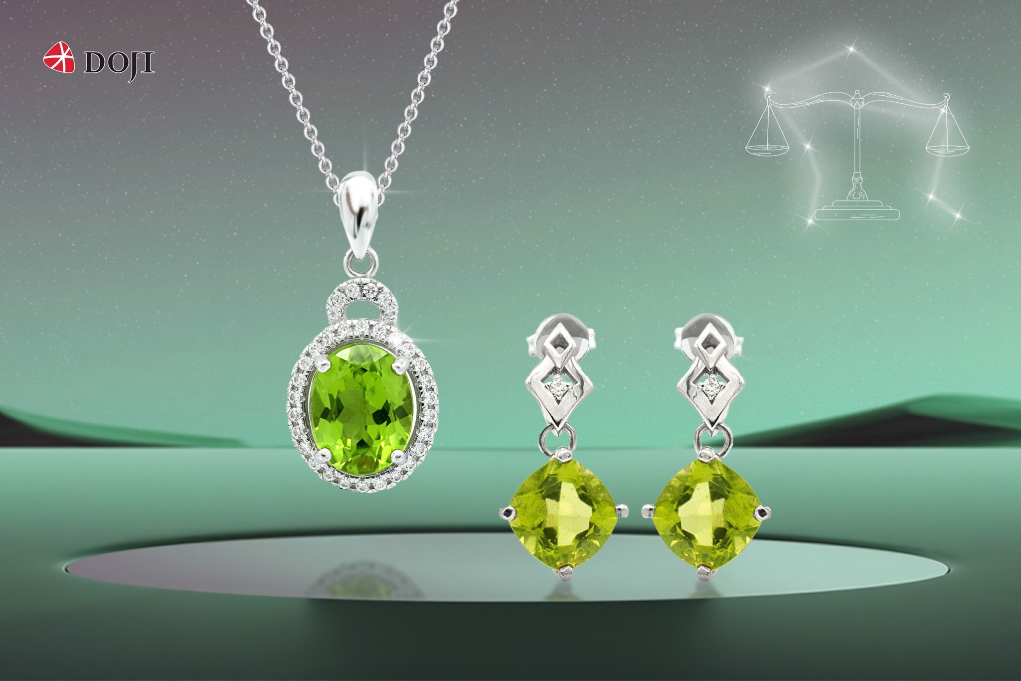 Trang sức đá màu Peridot kết hợp với chất liệu vàng trắng còn giúp quý cô Thiên Bình trông rạng rỡ, sang trọng hơn.