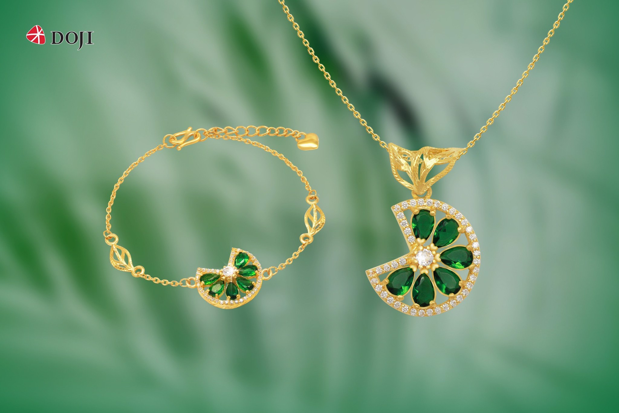 Bộ trang sức vàng 24K với tinh thần chủ đạo từ trái chanh căng mọng miền nhiệt đới, kết hợp những gam màu sống động, bắt mắt như xanh lá cây, vàng giúp phái đẹp thêm phần cuốn hút và tươi mới trong mắt người đối diện.