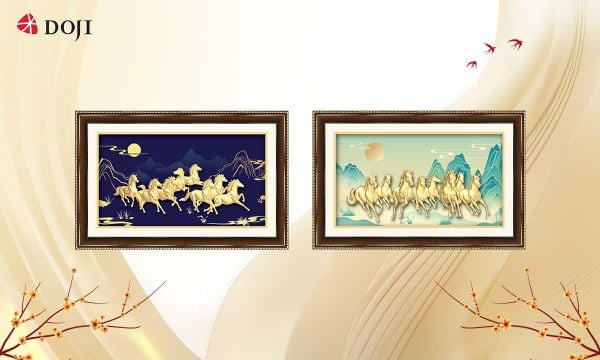 Điểm nhấn ấn tượng nhất trong bộ sưu tập năm nay chính là dòng tranh Kim Mã với các sản phẩm như Bát Mã Vinh Hoa, Bát mã Khải Hoàn và Kim Mã Vượng Tài. Những bức tranh này không chỉ là vật phẩm trang trí mà là một câu chuyện về sự đoàn kết và ý chí vươn lên. Hình ảnh bát mã phi nước đại được chế tác nổi 3D tinh xảo trên những nền màu phong thủy như sắc xanh thẳm của bầu trời đêm hay cảnh sơn thủy hữu tình lúc bình minh, tạo nên sự giao thoa tuyệt vời giữa hội họa truyền thống và kim hoàn hiện đại. Việc treo một bức tranh Kim Mã tại phòng khách hay văn phòng lãnh đạo không chỉ giúp không gian trở nên bề thế, sang trọng mà còn thể hiện tầm nhìn và khát khao bứt phá của người sở hữu trong năm mới.