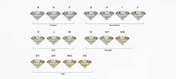 Thang đo màu kim cương của GIA được sắp xếp theo bảng chữ cái từ D đến Z, kim cương trong suốt, càng gần chữ D thì độ tinh khiết càng cao và có giá trị lớn. Dựa trên từng cấp độ, màu sắc, kim cương được chia thành 5 nhóm chính như sau: Không màu (Colorless), Gần như không màu (Near Colorless), Mờ (Faint), Vàng sáng (Very Light), và Ngả vàng (Light).