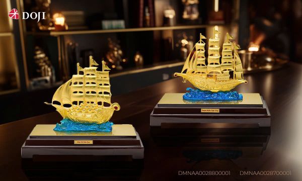 Trong phong thuỷ, thuyền buồm đón gió – xuôi dòng là biểu tượng của tài lộc dồi dào, công việc hanh thông và thịnh vượng bền vững. Bộ sưu tập tượng thuyền vàng 24K của DOJI được chế tác bằng công nghệ nano phủ vàng 24K độc quyền, thể hiện kỹ nghệ kim hoàn tinh xảo. Từng đường nét sóng nước, cánh buồm và mũi thuyền đều được trau chuốt tỉ mỉ, tôn lên vẻ đẹp sang trọng xứng tầm quà tặng cao cấp.