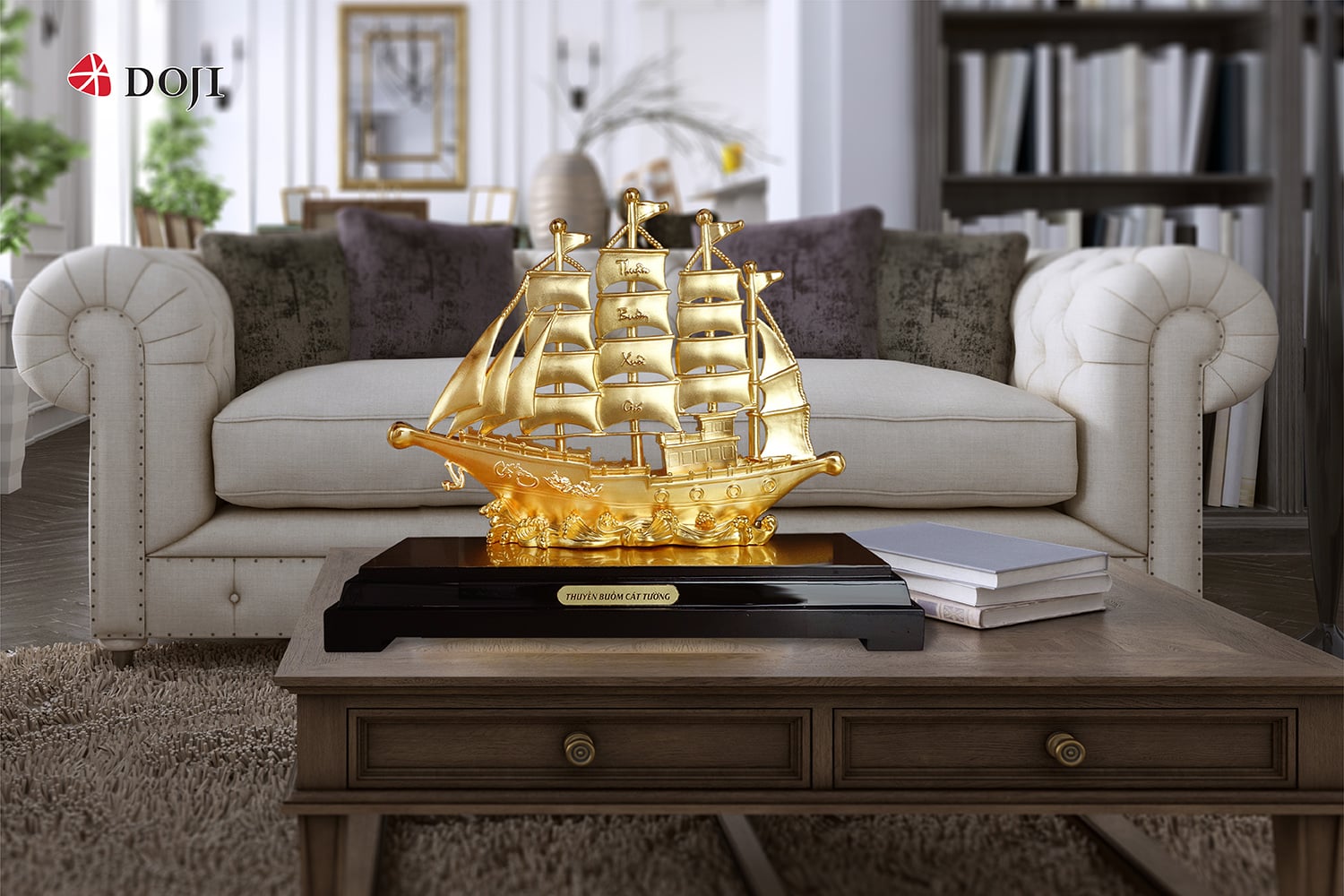 Với chủ đề "thuận buồm xuôi gió", tượng thuyền buồm phủ vàng 24K biểu đạt sự mạnh mẽ hướng về phía trước với ngụ ý vạn sự hanh thông. Thiết kế thuyền buồm cưỡi trên những ngọn sóng uốn cong sống động tạo thành một biểu tượng phong thủy thu hút may mắn, tài lộc.