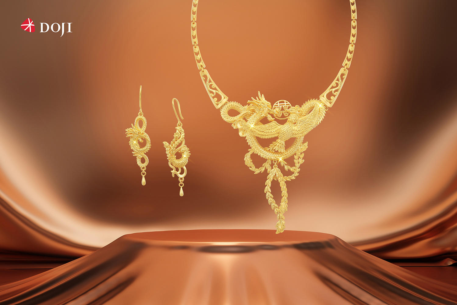 Tiếp tục dựa trên nguồn cảm hứng từ sự cộng hưởng giữa hai vẻ đẹp uy nghi và quý phái, DOJI mang đến bộ sản phẩm kiềng, bông tai "Long Phụng Cát Tường".