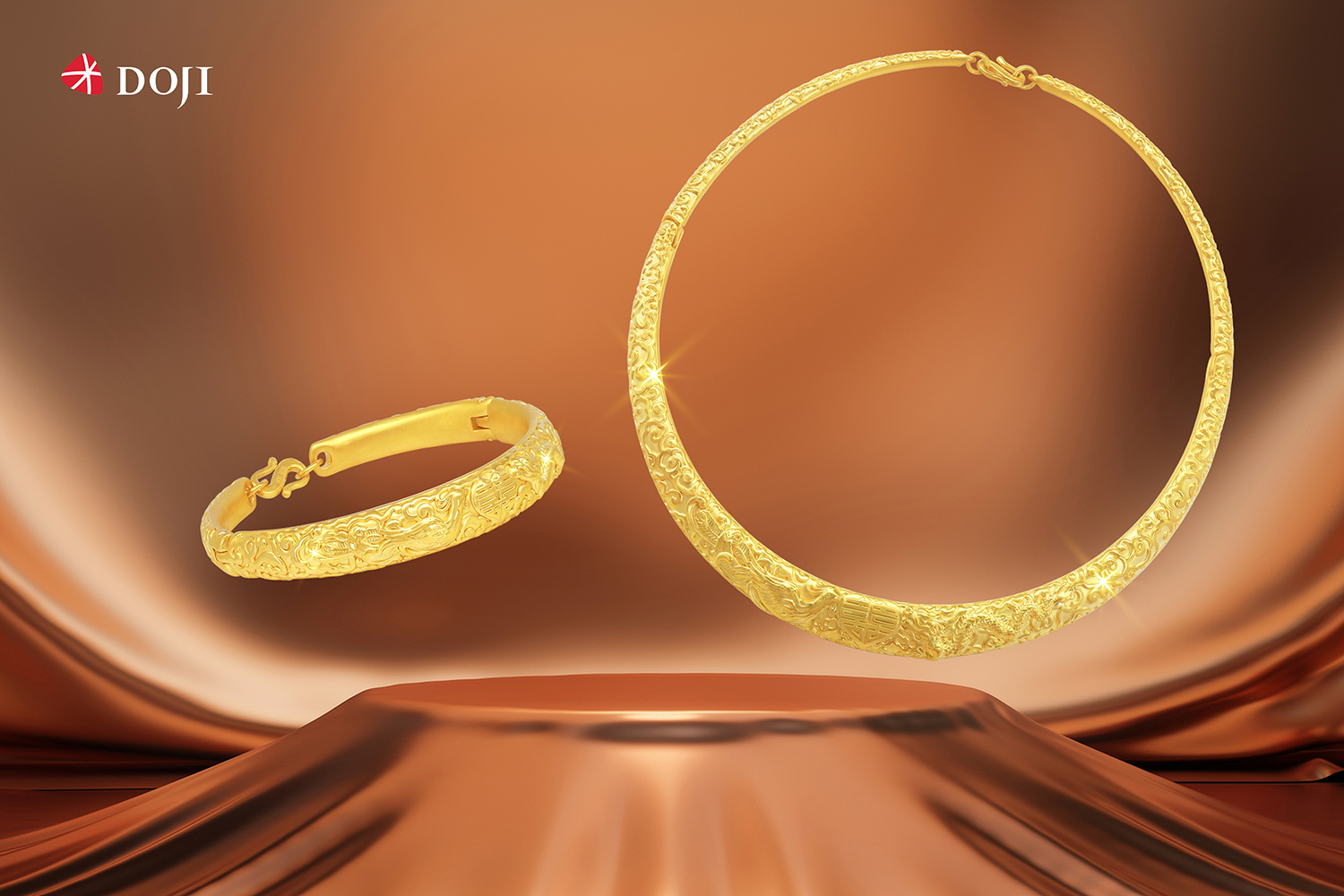 Vàng 24K tiếp tục là chất liệu chủ đạo được các nhà thiết kế của DOJI sử dụng trong Bộ sưu tập này. Với lối chạm khắc nổi sống động, các hoa văn rồng - phượng được thể hiện khéo léo trên chiếc kiềng, vòng tay.