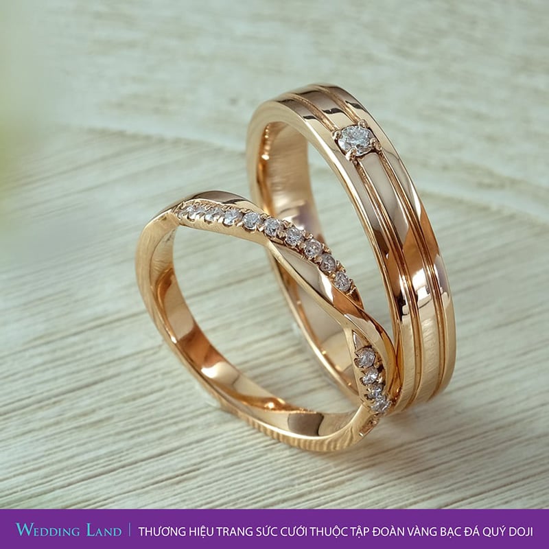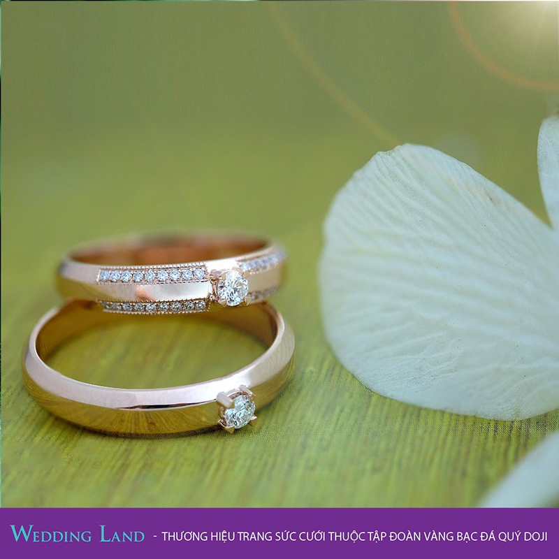 Wedding Land cũng được biết đến là Thiên đường nhẫn cưới với hàng ngàn sự lựa chọn với nhẫn nữ gắn nhiều kim cương lấp lánh với chất liệu vàng hồng, tạo phong cách thời thượng cho các cặp đôi. Cặp nhẫn nổi bật với những đường milgrain (chấu bi) viền bao quanh hàng kim cương kết trên đai nhẫn, thể hiện sự tự tin và năng động của cô dâu cá tính. Hay cặp nhẫn vàng trắng cùng họa tiết tinh tế sẽ "ghi điểm" với cô dâu sở hữu tính cách giản dị nhưng sâu sắc.