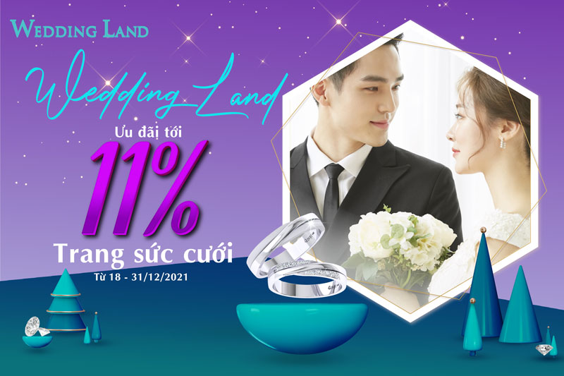 Từ ngày 18/12 – 31/12/2021, như một món quà dành tặng các cặp đôi về chung một nhà sau một năm đầy biến động của dịch COVID 19, Thương hiệu Wedding Land gửi tới “tân lang tân nương” ưu đãi tới 11% khi mua Trang sức cưới dịp cuối năm.
