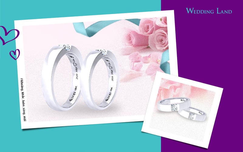 Nếu mặt ngoài của đôi nhẫn có thiết kế hướng tới sự tối giản, tinh tế, thì bên trong của đôi nhẫn, các chi tiết càng được đầu tư kỹ hơn. Lòng nhẫn được khắc dòng chữ “2020 Nhật ♥ Vân” và sau đó là hai chữ cái đầu tên của hai người được viết lồng vào nhau. Không những thế, ở trái tim nhỏ bên trong lòng nhẫn, một viên kim tấm được khảm thêm vào như sự khẳng định mạnh mẽ về tình cảm thủy chung và kiên định mà hai người luôn dành cho nhau. Việc thực hiện những chi tiết này là một thách thức không nhỏ khi phải thực hiện bên trong lòng nhẫn. Trong đó, khó nhất là việc khảm nạm viên kim cương ở chính giữa hai trái tim nhỏ, nó không chỉ đòi hỏi sự chính xác, tỉ mỉ từ những người thợ kim hoàn của Wedding Land để đảm bảo không làm ảnh hưởng tới mặt ngoài của đôi nhẫn.
