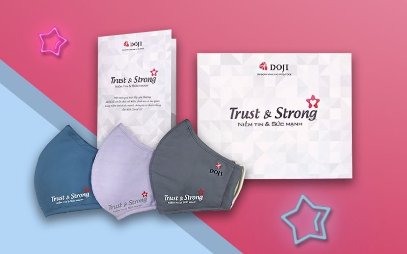 Từ 30.4-30.5, khách hàng mua bất kỳ sản phẩm trang sức của DOJI đều được tặng ngay 1 combo 3 khẩu trang kháng khuẩn “Trust and Strong” do DOJI thiết kế độc quyền. Đây là khẩu trang kháng khuẩn, được cung cấp bởi nhà sản xuất uy tín hàng đầu Việt Nam. Với những món quà này, DOJI mong muốn các khách hàng của mình luôn tỏa sáng trong các thiết kê độc đáo cũng như an toàn vượt qua mùa dịch bệnh.