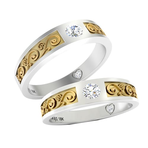 Đôi nhẫn Salsa với nhẫn nam có thiết kế khỏe khắn nhưng vẫn hòa quyện bên nhẫn nữ gắn nhiều kim cương tấm cầu kỳ, nữ tính.