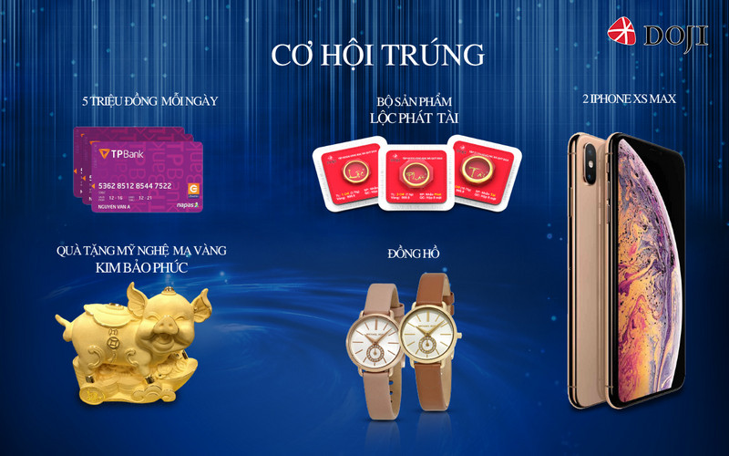 Ngoài ra, nhận ngay cơ hội trúng: 01 cặp iPhone XS max, 05 thẻ ATM TPBank mỗi thẻ trị giá 5 triệu đồng, bộ nhẫn Lộc Phát Tài, 02 sản phẩm Kim Bảo Phúc và 03 đồng hồ thời trang trị giá 5 triệu đồng.