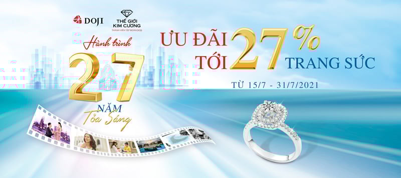 Đặc biệt, ngày 28/7/2021, DOJI và Thế Giới Kim Cương ưu đãi tới 27% các sản phẩm Trang sức Vàng 24K bán tính công và ưu đãi thêm 2,7% trên tổng hóa đơn đối với sản phẩm bán món.