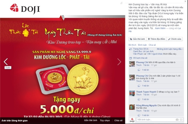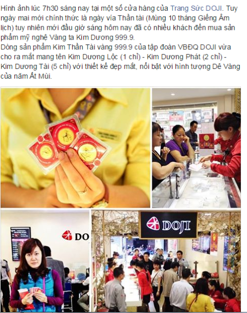 Bên cạnh đội ngũ bán hàng trực tiếp, các hoạt động truyền thông trên đài báo, facebook cũng được tiến hành rầm rộ từ nhiều ngày trước. Sáng 27/02, facebook Trang sức DOJI đã sớm thu thập tin bài để kịp thời cập nhật thông tin mới nhất đến khách hàng online