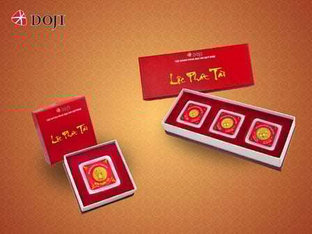 Nắm bắt xu hướng thị trường, Tập đoàn DOJI còn giới thiệu dòng sản phẩm hộp lì xì Kim Tài Lộc, được mạ vàng 999.9 và có mức giá chỉ 500.000 đồng, bao gồm: Khuyển Vàng Cầu May, Âu Vàng Tài Phát, Thần Tài Thịnh Vượng