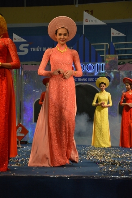 Dàn người mẫu chuyên nghiệp thể hiện Cô dâu Việt trong tà áo dài sẽ được tôn thêm vẻ duyên dáng, nữ tính với Bộ trang sức Long Phụng kỳ duyên được chế tác trên chất liệu Vàng 99.99 truyền thống
