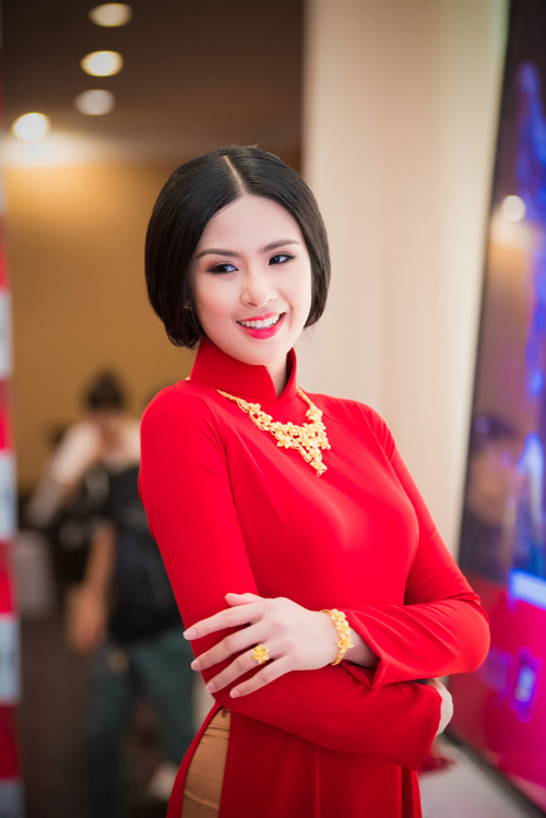 Một lát sau, cô đã thay bộ áo dài đỏ để tôn lên nét duyên dáng của người phụ Việt.