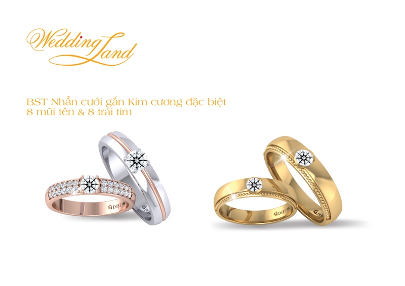 Với thiết kế hiện đại, chất liệu vàng phong phú, kim cương hoàn hảo, BST Nhẫn cưới gắn Kim cương 8 mũi tên & 8 trái tim hứa hẹn “hút” các cặp đôi