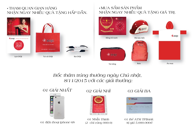 Ngoài ra, tại Hội chợ Quốc tế Trang sức Việt Nam 2015, trang sức DOJI áp dụng chương trình ưu đãi tới 30% cho Gems City- Trang sức đá màu, Diamond House- Trang sức Kim cương, Trang sức mẫu mã Ý- Hàn Quốc và công chế tác Trang sức Vàng ta Lộc Phát Tài, cùng nhiều quà tặng hấp dẫn và cơ hội trúng thưởng giá trị.