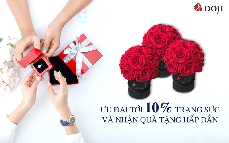Từ ngày 1/3 đến 10/3, khi mua sản phẩm nằm trong bộ sưu tập The Leading Star nhận ngay ưu đãi 5% và quà tặng ý nghĩa. Ngoài ra, trang sức DOJI dành tặng ưu đãi tới 10% toàn bộ trang sức, đồng hồ chính hãng. Chương trình áp dụng tại hệ thống trung tâm và cửa hàng vàng bạc trang sức DOJI trên toàn quốc