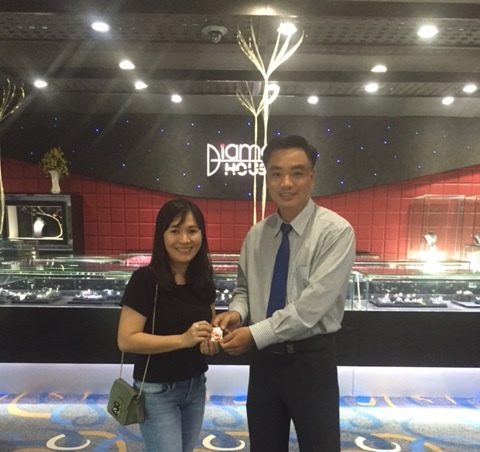 Chị Nguyễn Mỹ Linh (Đặng Văn Ngữ, P.10, Q.Phú Nhuận) là khách hàng may mắn trúng thưởng 2 chỉ nhẫn Vàng 999.9 khi mua Trang sức Kim cương Diamond House tại 66 Cách mạng tháng Tám, Q.3, T.HCM.