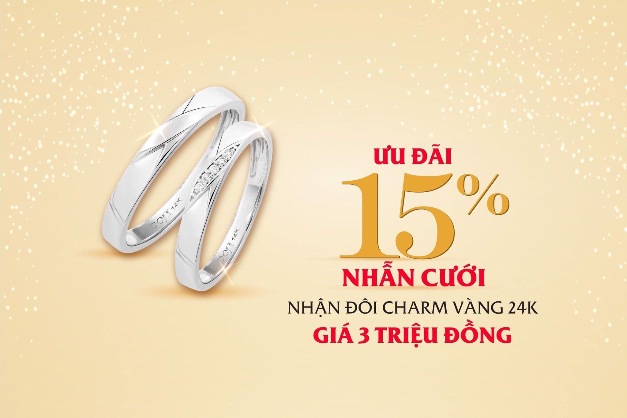 Mừng sinh nhật 29 năm "Vươn cao tỏa sáng", DOJI ưu đãi giới thiệu 600 cặp nhẫn cưới kim cương tự nhiên giá 6 triệu đồng nhằm tôn vinh vẻ đẹp lấp lánh của tình yêu đôi lứa (*). Đặc biệt, nhân dịp này, DOJI còn áp dụng ưu đãi nhân đôi hấp dẫn cho các sản phẩm nhẫn cưới, nhẫn đính hôn khác: Chương trình áp dụng từ nay đến hết 31/07/2023 tại hệ thống Trung tâm VBTS DOJI toàn quốc. (*) Không áp dụng cùng chương trình ưu đãi 15%. Xem thêm thông tin tại: Hotline: 18001168 Website: https://trangsuc.doji.vn/ Facebook: https://www.facebook.com/doji.trangsuc |