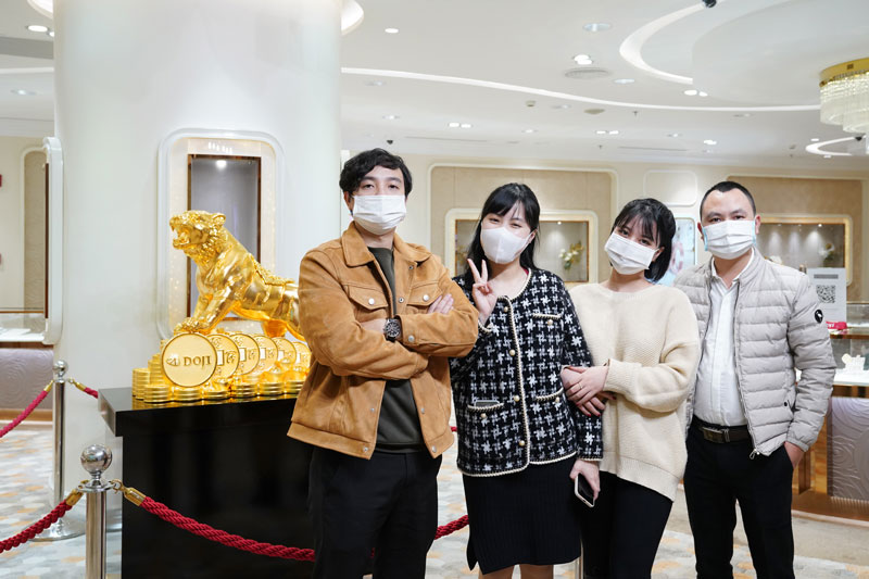 Các khách hàng tới mua vàng ngày Vía Thần tài đều hào hứng chụp hình cùng với kỳ linh Kim Dần Vương Bảo bằng vàng 999.9.