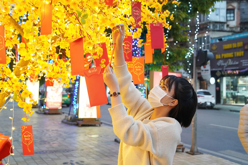 Khách hàng đến DOJI Tower ngoài việc mua Vàng cầu may, còn được tham gia hái lộc mai vàng để nhận voucher ưu đãi cùng cơ hội nhận các quà tặng giá trị.