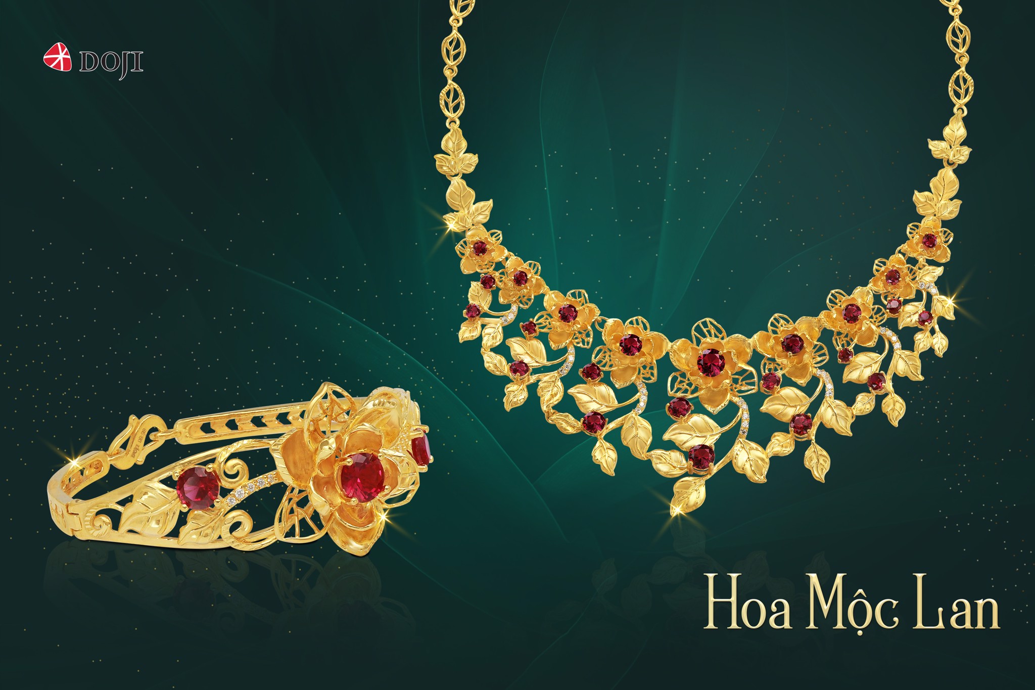 Mỗi bông hoa “vàng” được điểm xuyết bằng những viên đá Synthetic màu đỏ Ruby tỏa sáng nổi bật. Nhiều bông hoa ghép lại, tái hiện một vườn mộc lan rực rỡ, tràn ngập sức sống, bừng sáng kiêu hãnh với những đường nét uốn cong mềm mại, tinh xảo.