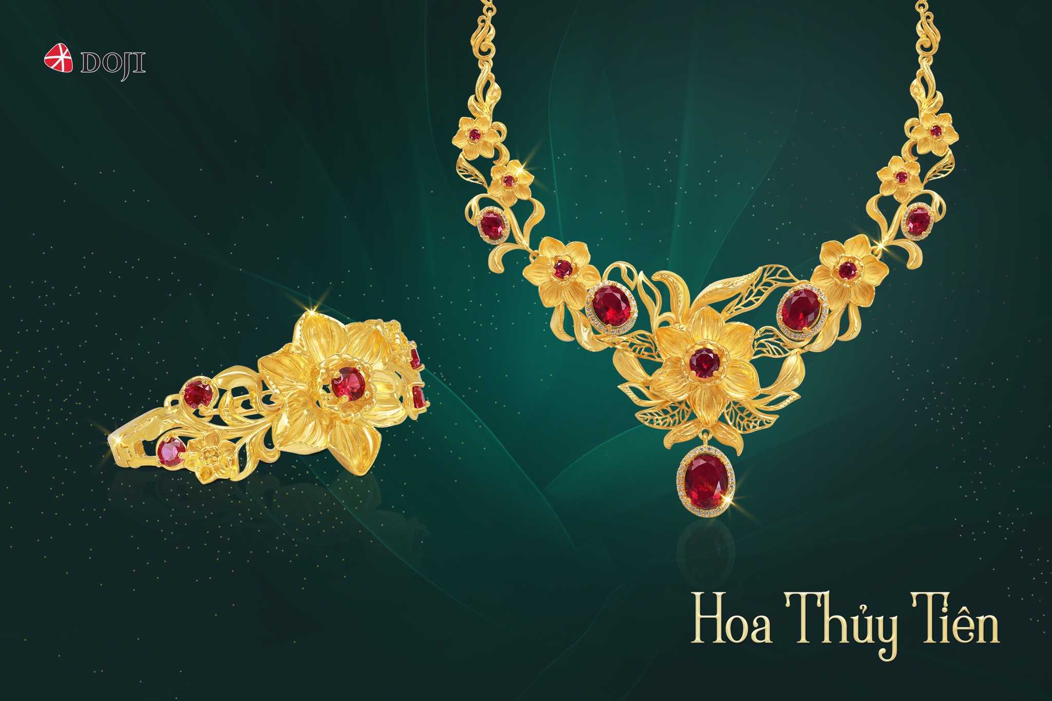 Hình ảnh hoa thủy tiên qua bàn tay của các nghệ nhân kim hoàn hiện lên đầy sống động, nổi bật với từng chi tiết tinh xảo, cầu kỳ. Với chất liệu vàng 24K tinh khiết kết hợp cùng đá Synthetic màu đỏ Ruby, tuyệt tác trang sức hoa thủy tiên giúp tôn vinh phong cách quyền quý, cao sang cho chủ sở hữu.