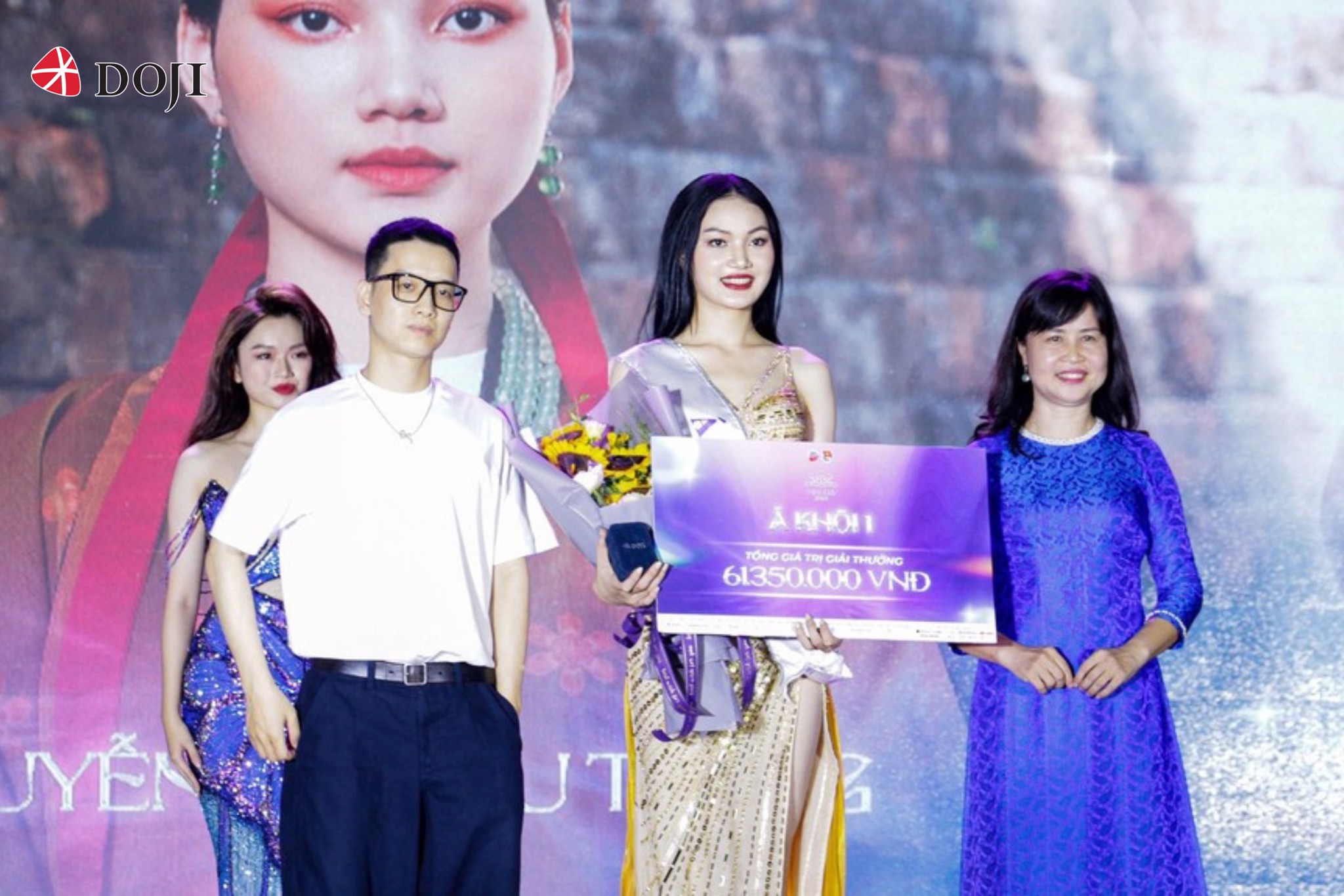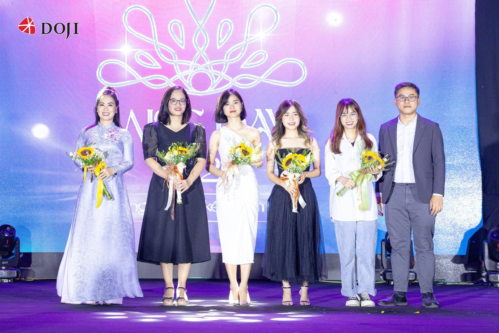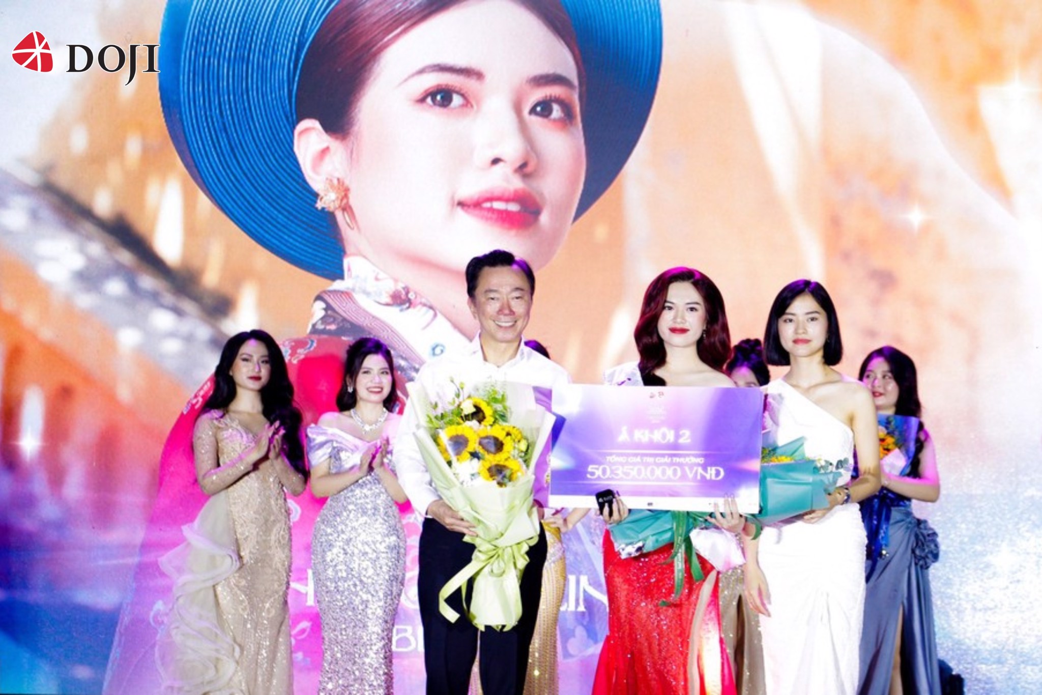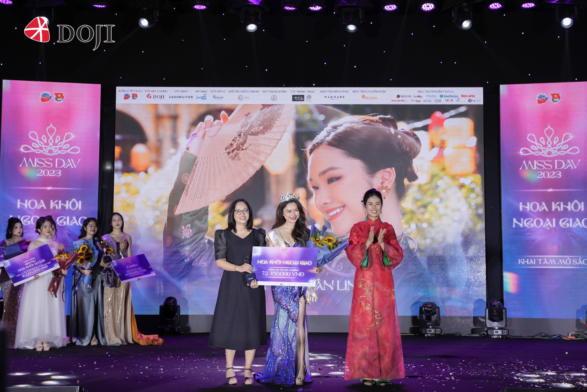 Với vai trò là nhà tài trợ kim cương của Miss DAV 2023, DOJI đã cùng Hoa hậu Ngọc Hân vinh dự trao giải Hoa khôi Học viện Ngoại giao cho nữ sinh Đoàn Thị Xuân Linh.