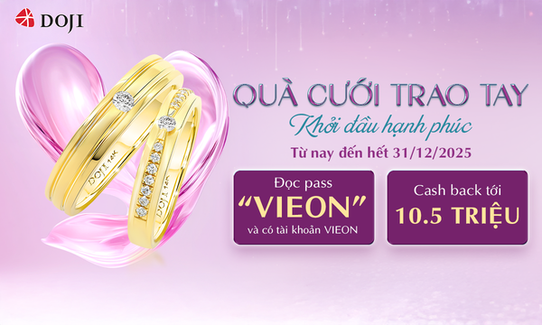 Theo đó, từ nay đến hết ngày 31/12/2025, khách hàng tham quan, mua sắm tại hệ thống TTTS DOJI chỉ cần đọc pass “VIEON” và xuất trình tài khoản Vieon sẽ được hưởng ưu đãi hoàn tiền hấp dẫn khi mua nhẫn cưới hoặc nhẫn đính hôn: Cash back tới 10,5 triệu đồng. Chi tiết ưu đãi Cash back: